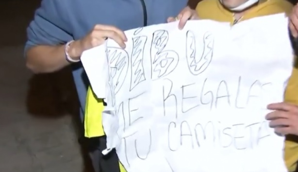 El chico vio que los jugadores se estaban retirando y levantó un cartel “Dibu regalame tu camiseta”. El jugador ya se había subido al micro, pero lo leyó, bajó y le entregó al pequeño hincha su remera.
