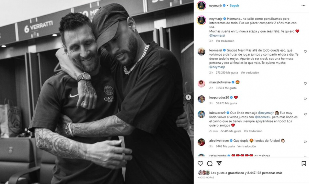 “Hermano… no salió como pensábamos pero intentamos de todo. Fue un placer compartir dos años más con vos. Mucha suerte en tu nueva etapa y que seas feliz. Te quiero”, escribió Neymar en una publicación que superó los 10 millones de likes.