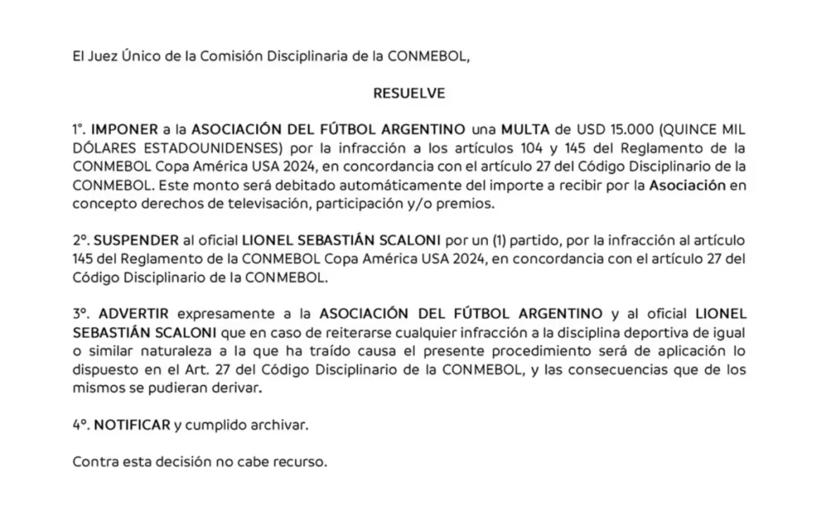 Advertir expresamente a la Asociación del Fútbol Argentino y al oficial Lionel Sebastián Scaloni que en caso de reiterarse cualquier infracción a la disciplina deportiva de igual o similar naturaleza a la que ha traído causa el presente procedimiento será de aplicación lo dispuesto en el Art. 2 del Código Disciplinario de la Conmebol, y las consecuencias que de los mismos se pudieran derivar”, aclararon en el comunicado.