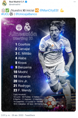 Mientras que el Real Madrid contará con un plantel formado por Thibaut Courtois, Dani Carvajal, Éder Militão, David Alaba, Ferland Mendy, Luka Modrić, Toni Kroos, Federico Valverde, Vinícius Júnior, Rodrygo y Karim Benzema.