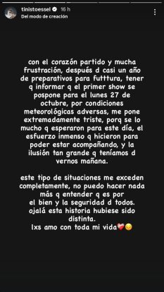 Visiblemente angustiada y al borde de las lágrimas, Tini se disculpó con su público, asegurando que la decisión fue tomada por motivos de fuerza mayor que “la exceden completamente”.