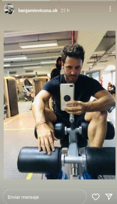 En una de las dos fotografías se lo puede ver a Benjamín Vicuña en un gimnasio realizando entrenamiento de fuerza y en la otra postal con una bicicleta con la leyenda “Triatlón“, confirmando que se está preparando para competir nuevamente.