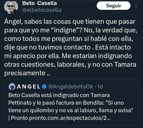 Seguido de ello Casella retomó las palabras textuales de su colega y se dirigió a la plataforma ‘X’ para lanzar un polémico descargo al respecto en donde señaló: “Ángel ¿Sabés las cosas que tienen que pasar para que yo ‘me indigne’? La verdad que, como todos preguntan si hablé con ella, dije que no tuvimos contacto. Está intacto mi aprecio hacia ella. Me estaría indignando otras cuestiones, laborales, y no con Tamara precisamente”.