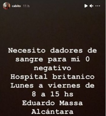 Eduardo “Cabito” Massa Alcántara utilizó su cuenta de Instagram para comunicar que se encuentra internado. “Necesito dadores de sangre para mí. 0 negativo. Hospital Británico de lunes a viernes de 8 a 15 horas” escribió.