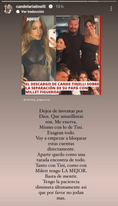 Los dichos de la modelo se dieron en el marco de otros de los rumores que comenzaron a circular y que también la tenían como protagonista en donde señalaban la mala relación que Lele habría tenido con Millet Figueroa, la ex pareja de su padre, quienes habrían culminado su romance a partir de la nula aceptación por parte de las Tinelli.