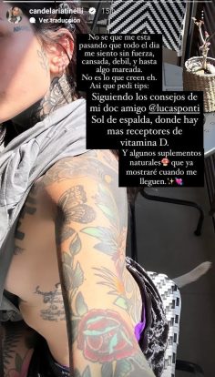 Por otra parte, la artista regresó a su contenido habitual en donde aprovechó para dar a conocer uno de los recientes descubrimientos que no tardó en compartir con su comunidad, especialmente con aquellas personas que tienen a sentirse con poca energía en el día a día. “No sé qué me está pasando que todo el día me siento sin fuerza, cansada, débil y hasta algo mareada. No es lo que creen, eh. Así que pedí tips: siguiendo los consejos de mi doc amigo, sol en la espalda, donde hay más receptores de vitamina D”, señaló la cantante junto a una fotografía aplicando esta técnica.