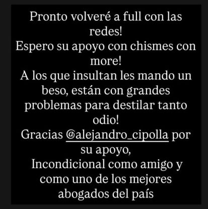 Tal y como adelantó su defensor en diálogo con la prensa, Rial aseveró estar viviendo el momento más difícil de su vida pero se mostró confiada en sus abogados para poder regresar a trabajar en sus redes cuanto antes. “Pronto volveré a full, espero su apoyo con ‘Chimes More’, a los que insultan les mando un beso, están con grandes problemas para destilar tanto odio”, destacó la hermana de Rocío.