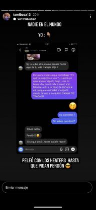 “¿Por qué te molesta que no trabaje? ¿En qué te perjudica a vos? Cuando yo quiera hacer algo lo hago. ¡Vos no tenés idea de mi vida ni quién soy! Mientras crío a mi hija y la disfruto al mil, porque es mi bebé, y tengo la suerte de que si no quiero trabajar, no trabajo“, fue la contundente respuesta de la joven de 22 años. “Peleo con los haters hasta que me pidan perdón”, finaliza la historia de Tamara Báez.