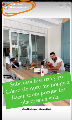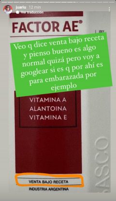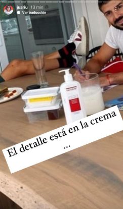 Juariu compartió una serie de fotos, donde ambos están comiendo con amigos y hay algo en la mesa: una crema corporal. En el envase, se puede leer “venta bajo receta.”