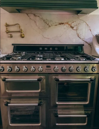 El aparato tiene tres hornos eléctricos, dos hornallas chicas, dos medianas y dos grandes, además de una ultra rápida. Además, cuenta con un horno principal multifunción convector programable, otro secundario multifunción con distribuidor de calor y otro auxiliar.