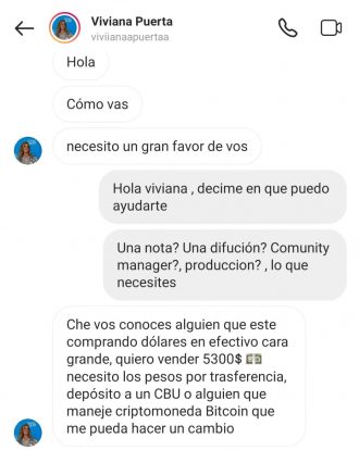 El periodista Pablo Layús, recibió un mensaje privado a su cuenta personal de Instagram. ” Che vos conoces alguien que este comprando dólares en efectivo cara grande, quiero vender 5300$ dólares, necesito los pesos por trasferencia, depósito a un CBU o alguien que maneje criptomoneda Bitcoin que me pueda hacer un cambio”, decía el mensaje en nombre de Viviana.