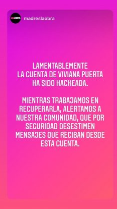 Horas más tardes, la actriz pudo acceder a su cuenta personal de Instragam. Viviana grabo un mensaje para todos sus seguidores en donde explicó que desde su entorno están haciendo todo lo posible para dar con la persona que se apropio de su red social.
