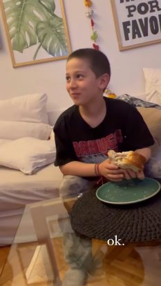 Luego compartió el video en que Momo comió una hamburguesa doble a las 5 de la tarde, por lo cual dijo a su hijo: “¿A qué edad pensás empezar a laburar? Si seguís comiendo así, vas a tener que trabajar”, en lo cual Moni estuvo de acuerdo: “Y sí, comés mucho”.