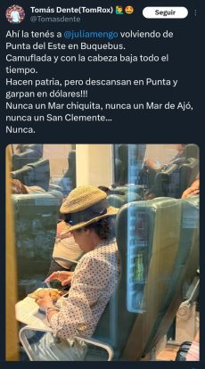 Respecto a las burlas por su apariencia, la periodista negó estar intentando pasar desapercibida o estar “camuflada” bajo su sombreroy explicó que utilizó el accesorio simplemente por una cuestión estética de su cabello y desmintió la versión de que ocultaba su rostro por vergüenza. “El infeliz de Tomás Dente miente diciendo que vuelvo de Punta del Este, no todo el que vuelve de Buquebus vuelve de Punta del Este”, disparó la comunicadora, visiblemente molesta por la viralización de la fotografía.