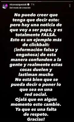Una ola de publicaciones en redes sociales encendió la alarma sobre la supuesta dulce espera del actor con su actual pareja, colega en la obra teatral ‘Rocky’. Ante la velocidad de la noticia falsa, Vázquez utilizó su perfil digital para emitir un contundente descargo.