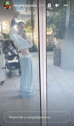 En su estadía en Estados Unidos, Eugenia publicó una sugerente postal en la que se puede apreciar su figura, ya que muestra sutilmente sus curvas. Aunque lo llamativo de la fotografía es el pantalón  oversize que le sobresale. De fondo aparece Amancio en su cochecito.