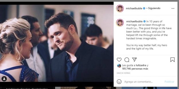 Antes del tierno clip que compartió Luisana Lopilato en su cuenta de Instagram, Michael Bublé publicó un mensaje lleno de amor para festejar sus diez años de matrimonio. “Eres mi mejor mitad, mi héroe y la luz de mi vida”, escribió el artista canadiense, generando cientos de reacciones de sus seguidores.