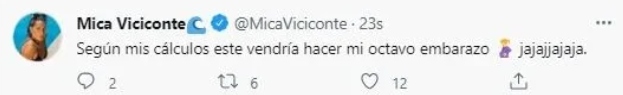 El rumor del embarazo se fue asentando cada vez más, pero Mica Viciconte utilizó su cuenta de Twitter para desmentir esta noticia. “Según mis cálculos este vendría a ser mi octavo embarazo“, publicó la influencer.