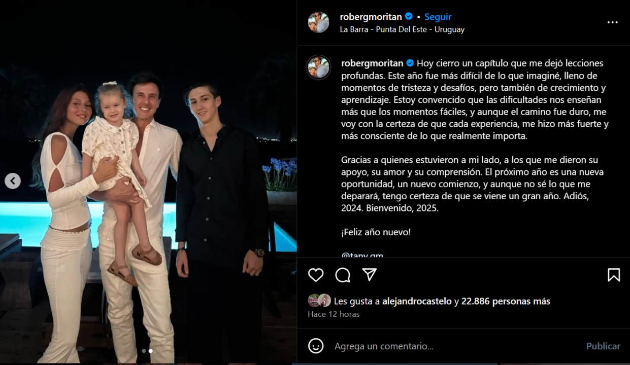 “Gracias a quienes estuvieron a mi lado, a los que me dieron su apoyo, su amor y su comprensión. El próximo año es una nueva oportunidad, un nuevo comienzo, y aunque no sé lo que me deparará, tengo certeza de que se viene un gran año. Adiós, 2024. Bienvenido, 2025. ¡Feliz año nuevo!”, finalizó Moritán.