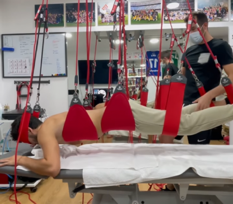 Un rato más tarde, seguía recostado en una camilla, pero esta vez sobre cintas sujetadas con poleas. “Lollll esto que es”, expresó, antes de someterse al ejercicio.