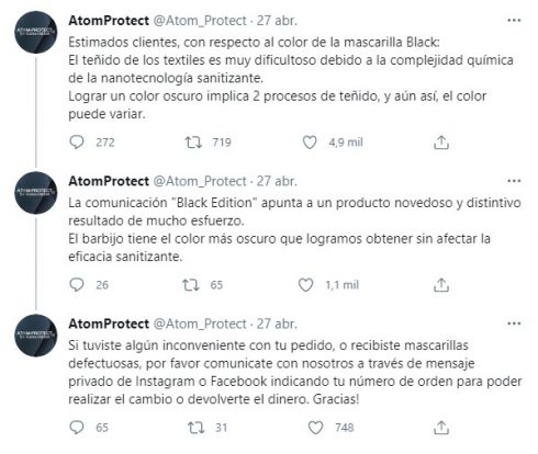 Por eso desde las redes oficiales de los famosos tapabocas, salieron a explicar el por qué: “Estimados clientes: con respecto al color de la mascarilla black, el teñido de los textiles es muy dificultoso debido a la complejidad química de la nanotecnología sanitizante.”