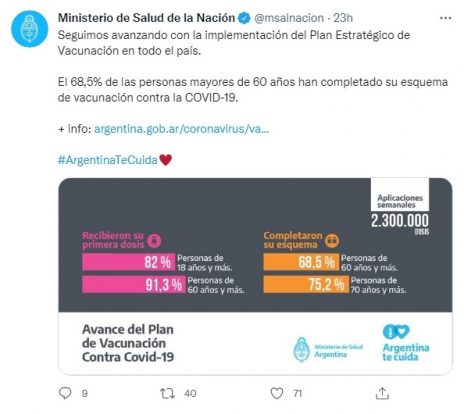 El Ministerio de Salud de la Nación informó el viernes que el 68,5% de las personas mayores de 60 años han completado su esquema de vacunación y que el 82% de los mayores de 18 años tiene por lo menos, la primera dosis.