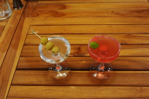 Un cóctel refrescado y lo decoramos con aceitunas verdes.