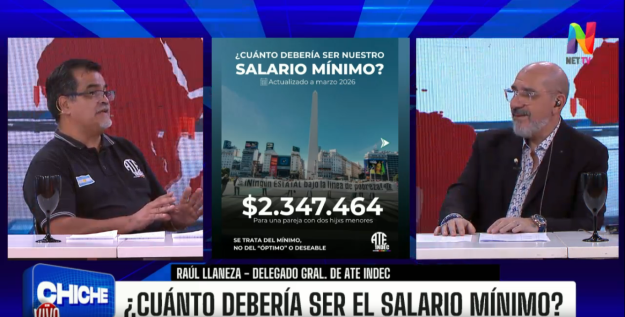 Desde ATE Indec planteamos desde 2011 un salario mínimo que tiene que ver con la canasta que mide el iNDEC que hoy está en $2.347.464, según los datos actualizados a marzo del 2026 por el INDEC, para una familia integrada por dos adultos y sus dos hijos menores“, comenzó diciendo el entrevistado a través de la pantalla de NET TV.