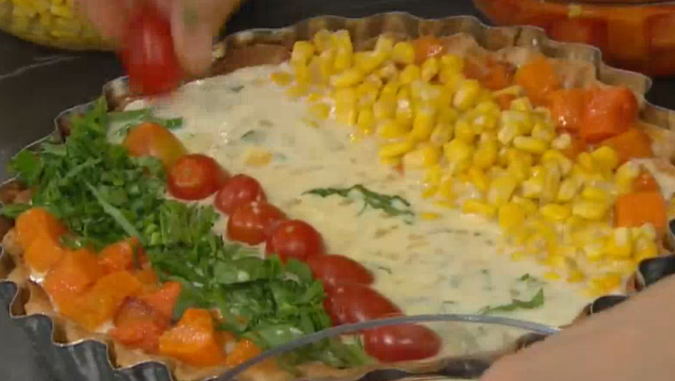 Una excelente combinación de tomates cherry, queso, calazaba, espinaca, choclo y otros ricos sabores y colores para preparar esta variada y saludable tarta, digna para una foto.