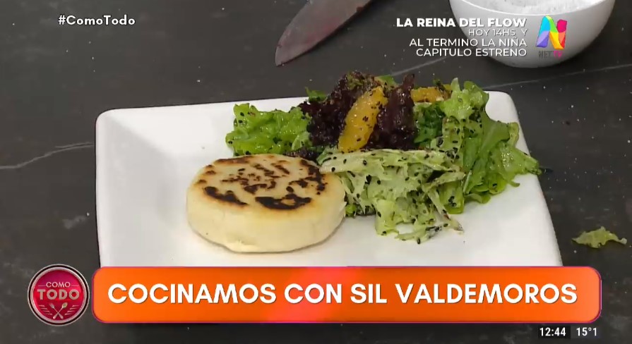 La cocinera preparó arepas rellenas con champiñones y espinaca, acompañadas por ensalada de hojas verdes, naranja, semillas y mayonesa de remolacha. Mirá:
