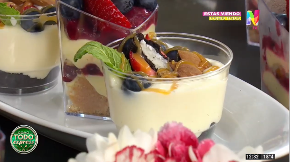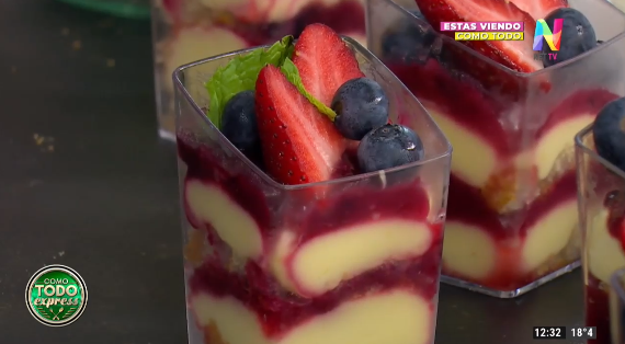 Para la crema de limón mezclar 110 g de azúcar, 13 g de fécula de maíz o dos cucharadas, 75 g de jugo de limón, 25 g de manteca, 25 de agua y ralladura de limón. Llevar al fuego. Una vez que lo sacamos del fuego, batir enérgicamente, luego tapar con film y llevar a la heladera. Finalmente sumar crema pastelera y agregar crema de leche tres puntos batida. Por otro lado mezclar 150 g de frutos rojos, con 125 g de azúcar, 1 cda de fecula y juego de limón. Llevar al fuego y revolver. Para el armado poner en el recipiente una base de galletitas de vainilla, poner la crema de limón, sumar la preparación de frutos rojos e ir intercalando con crema de limón y frutos rojos. Decorar con frutillas y arándanos.