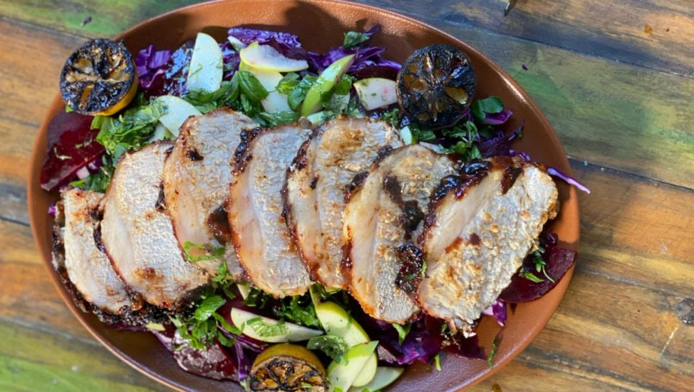 CARRÉ DE CERDO “FROTADO” CON BARBACOA Y ENSALADA DE MANZANA-REMOLACHA