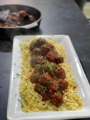 - Volcar la pasta en una asadera y por encima la salsa acomodando los polpetines. Eventualmente se pueden agregar tajadas de mozzarella y gratinar. buen apetito.