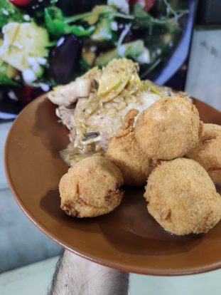 CHULETAS DE CERDO AL VINO BLANCO CON BOMBITAS DE BATATA FRITAS