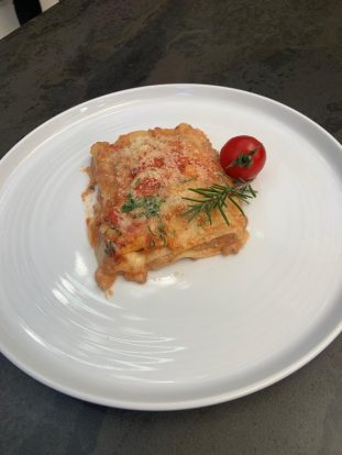 - Armar la lasaña intercalando la masa con salsa blanca, ragú y queso en forma repetida hasta formar una mil hojas.