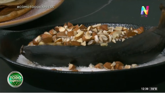 Tomar la banana y realizarle un corte a lo largo. Luego, en un recipiente para horno, colocarla reposada sobre sal gruesa. Este ingrediente ayudará a que la banana no se mueva para ningún lado. Cocinar unos minutos.