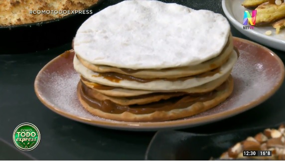 En un plato, colocar una mínima porción de dulce de leche para comenzar a armar la torre. Luego, sumar tapa a tapa con más dulce en los medios.