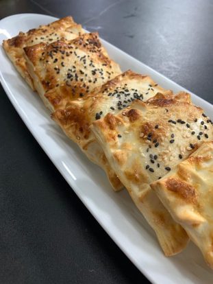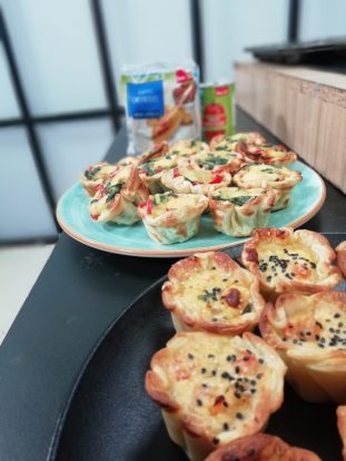 - Colocar una buena cucharada de relleno en cada canastita, espolvorear con queso rallado y semillas de sésamo, y llevar nuevamente al horno a 200*C, por unos 15 minutos o hasta que estén doraditas.