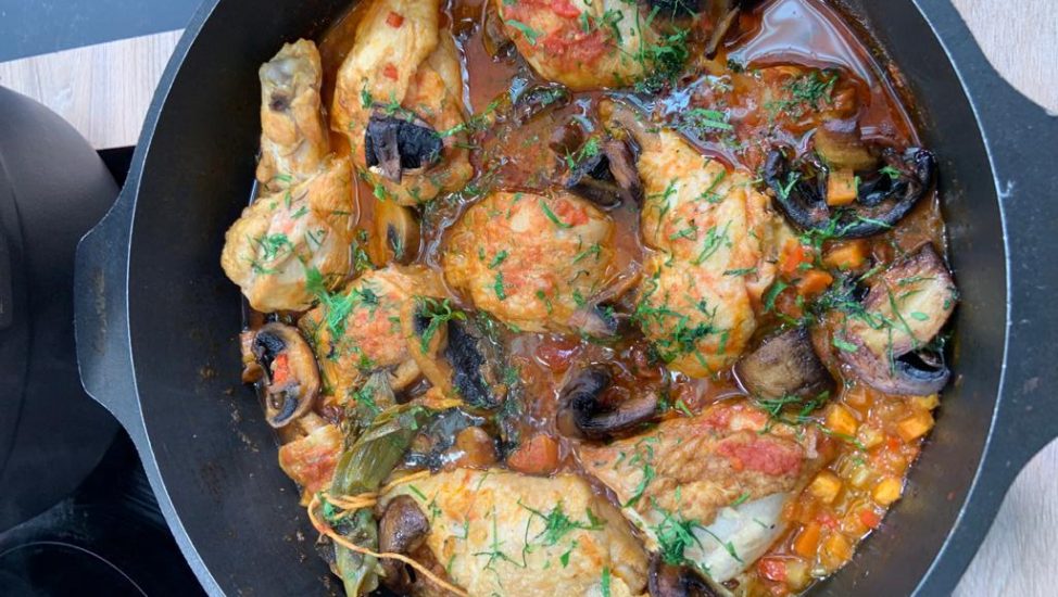 - Incorporamos el tomate picado un poco de caldo, tapamos la cazuela y lo cocemos a fuego lento 45 minutos, hasta que el pollo esté hecho por dentro. Esparcimos el perejil.