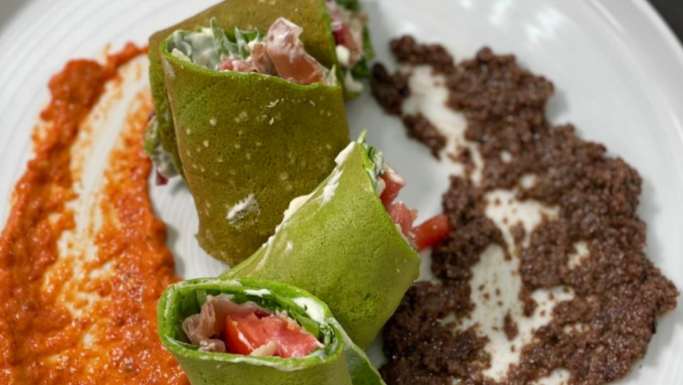 CREPS DE ESPINACA CON JAMÓN CRUDO, RÚCULA, PARMESANO Y TAPENADE CON SALSA DE MORRONES ASADOS