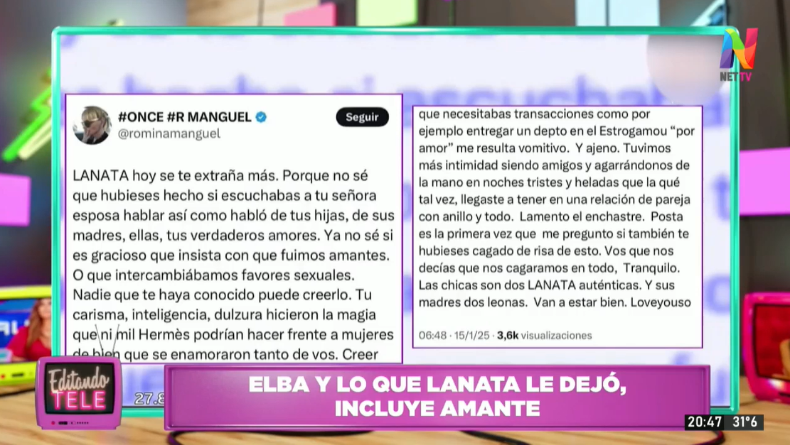 En un nuevo programa de Editando tele con Luis Piñeyro y gran equipo compartieron las declaraciones de Elba Marcovecchio en una entrevista con Ángel de Brito. La abogada y esposa de Jorge Lanata reveló que Romina Mangel fue amante del periodista.