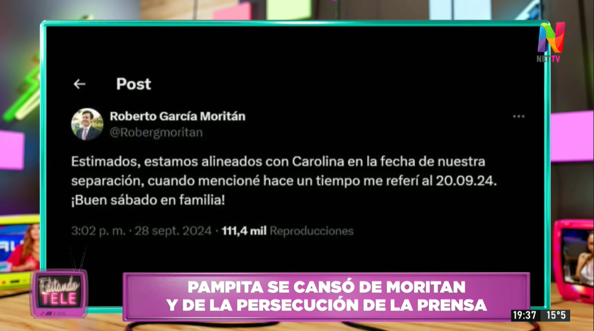 Automáticamente Moritán ratificó los dichos de la modelo en una contundente historia. “Estimados, estamos alineados por supuesto con Carolina en la fecha de nuestra separación, cuando mencioné hace algún tiempo me referí al 20.09.24. Buen sábado en familia”, escribió. La modelo también descartó la posibilidad de la entrevista con Susana Giménez dejando en claro que no televisará su separación.