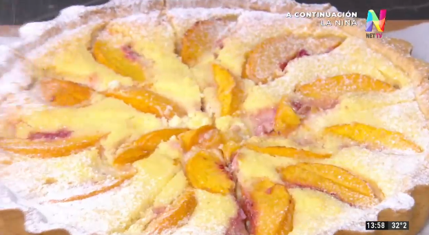 Mezclar la manteca con el azúcar, añadir las yemas de huevo de a una y mezclar. Agregar la esencia de vainilla, mezclar. Y por último añadir la harina y unir sin amasar. Envolver en papel film y reservar en la heladera mínimo 1 hora. Para el relleno mezclar en un bol la ricotta, el azúcar, el huevo y la ralladura de naranja. Una vez integrado añadir la fecula y mezclar. Reservar. Extender la masa entre 2 papel manteca, retirar el papel de uno de los lados y forrar la tartera con la masa, retirar el papel de la superficie. Rellenar. Decorar con los duraznos cortados en rodajas, siguiendo la forma circular de la tartera para formar una flor. Cocinar en horno a 170ºC durante 50 minutos. Dejar enfriar y espolvorear con azúcar impalpable.