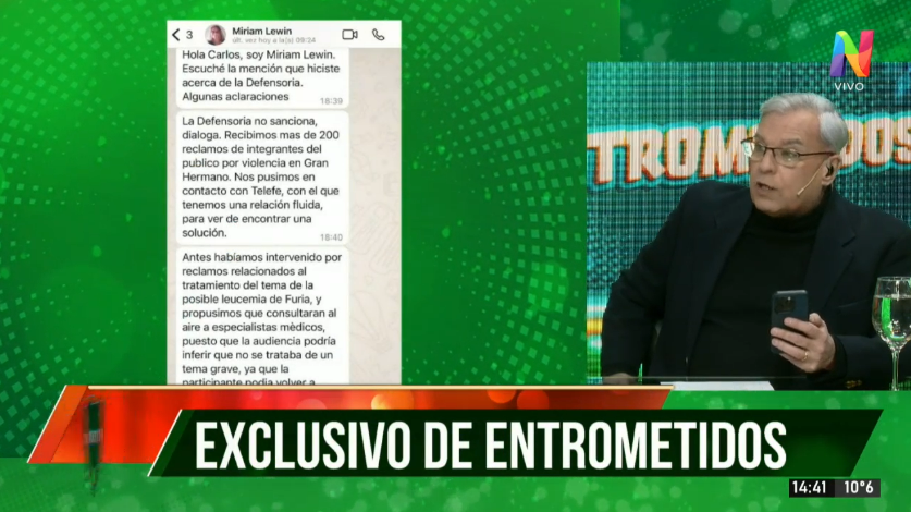 Asimismo el presentador continuó con la lectura del mensaje recibido por parte de Lewin en donde parafraseó: “Antes habíamos intervenido por reclamos relacionados al tratamiento del tema de la posible leucemia de Furia, y propusimos que consultaran al aire a especialistas médicos, puesto a que la audiencia podría inferir que no se trataba de un tema grave’ cosa que acá se planteó, el mismo pensamiento que tuvimos nosotros lo tiene Miriam Lewin y la Defensoría (…) por ahora evidentemente la decisión es que Furia siga como si nada, como sea a como esté, esta es la realidad”.