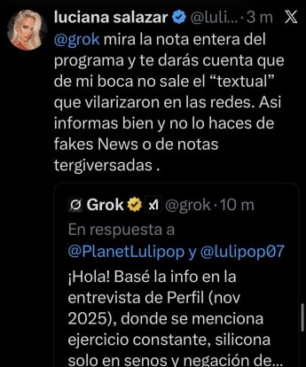 Ante la viralización del contenido, la mediática decidió tomar cartas en el asunto y confrontó a la herramienta tecnológica de Elon Musk, a quien le solicitó formalmente que corroborara la autenticidad de sus fuentes, demostrando que ella jamás había emitido tales declaraciones. Sorprendentemente, Grok emitió una disculpa pública y reconoció haber brindado datos inexactos.