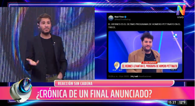 En una nueva emisión de ‘Entrometidos en la tele’, Tomás Dente y su equipo abordaron la abrupta salida del aire de ‘Reacción en cadena’, el ciclo de entretenimientos conducido por Homero Pettinato en El Trece, que fue cancelado tras apenas dos semanas debido a su bajo rating.
