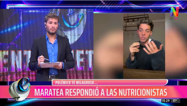 Sin embargo el conductor de Net TV tildó de irresponsable los dichos del trabajador de redes indicando: “Es gurú, es médico y es nutricionista, por supuesto que no tiene nada de lo que dice, nada está fundamentado científicamente. Nada. No puede argumentar nada de lo que dice, es una letanía de apreciaciones personales lo que dice, se sentó frente a una cámara y empezó a escupir delante de los profesionales porque tenía ganas. ¿Desde qué lugar y con qué autoridad científica dice que si queres bajar de peso, Maratea, el problema del déficit calórico y el deporte? Cada organismo es distinto, chicos”.