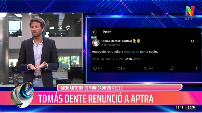 El presentador de Net TV hizo pública su renuncia a la Asociación de Periodistas de la Televisión y la Radiofonía Argentinas (APTRA) a través de sus redes sociales. La decisión se dio en un contexto de fuerte agitación interna y cuestionamientos generalizados hacia la ceremonia de premios.