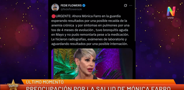 Cabe mencionar que uno de los primeros en informar sobre el estado de salud de la exmodelo fue Fede Flowers en su cuenta de X durante la madrugada de este miércoles. “Ahora Mónica Farro en la guardia esperando resultados por una posible recaída de la anemia crónica y por síntomas en pulmones por una tos de cuatro meses de evolución“, escribió el periodista especializado en espectáculos y ex Gossip.