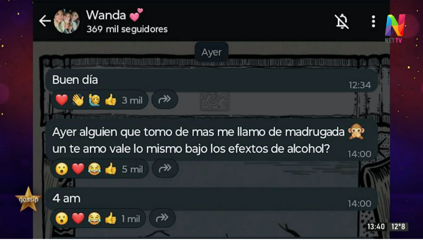 En una nueva entrega de ‘Gossip’, Esthercita presentó un informe que puso el foco en los mensajes que Wanda Nara compartió en su canal de difusión de WhatsApp en las últimas horas, donde insinuó que un ex la contactó de madrugada bajo los efectos del alcohol. La empresaria y conductora detalló que recibió un llamado a las 4 de la mañana, lo que desató especulaciones sobre si el futbolista del Galatasaray era el protagonista de este contacto.